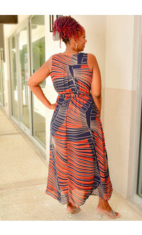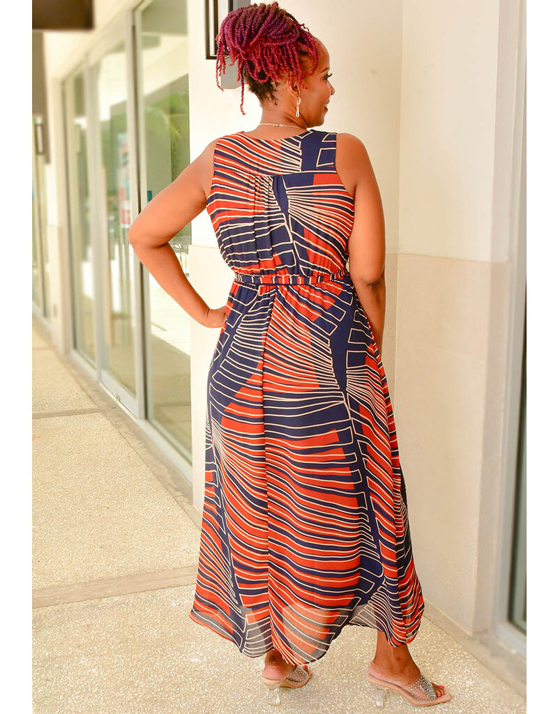 Classic meets contemporary in the Signature Striped Wrap Midi Dress. This effortlessly chic piece features a striking mix of navy, rust, and ivory stripes in an abstract wave pattern, creating a bold yet sophisticated look. The wrap silhouette with a tie waist flatters every figure, while the sleeveless design and midi length make it perfect for warm-weather occasions. Whether you're dressing it up for an evening out or keeping it casual for daytime wear, this dress is a must-have for your wardrobe.