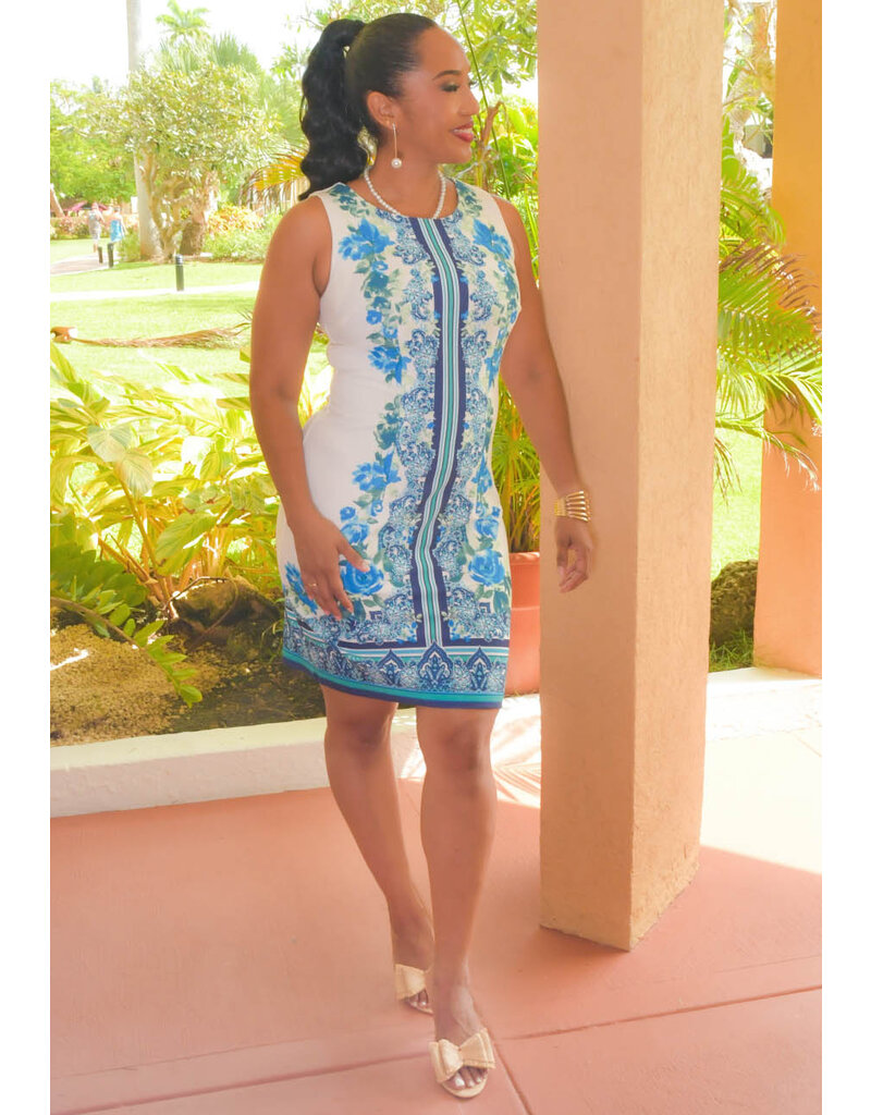 Featuring a stunning blue floral pattern with intricate border detailing, this sleeveless dress combines classic style with a modern twist. The tailored fit highlights your silhouette, while the soft, comfortable fabric ensures all-day wearability. Perfect for both casual outings and special occasions, this dress pairs beautifully with simple accessories and your favorite footwear for a polished look.