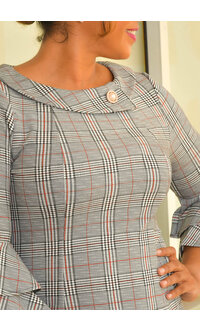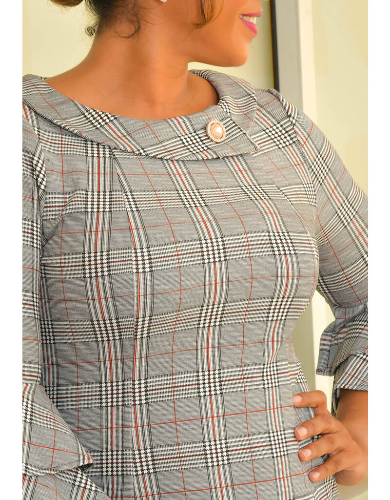 Embrace timeless elegance with this classic plaid dress, featuring a sophisticated grey and red check pattern. The knee-length design is accented with stylish bell sleeves, adding a touch of femininity to the structured silhouette. A charming decorative button at the neckline and pleated detailing enhance its polished look. Ideal for both work and casual outings.